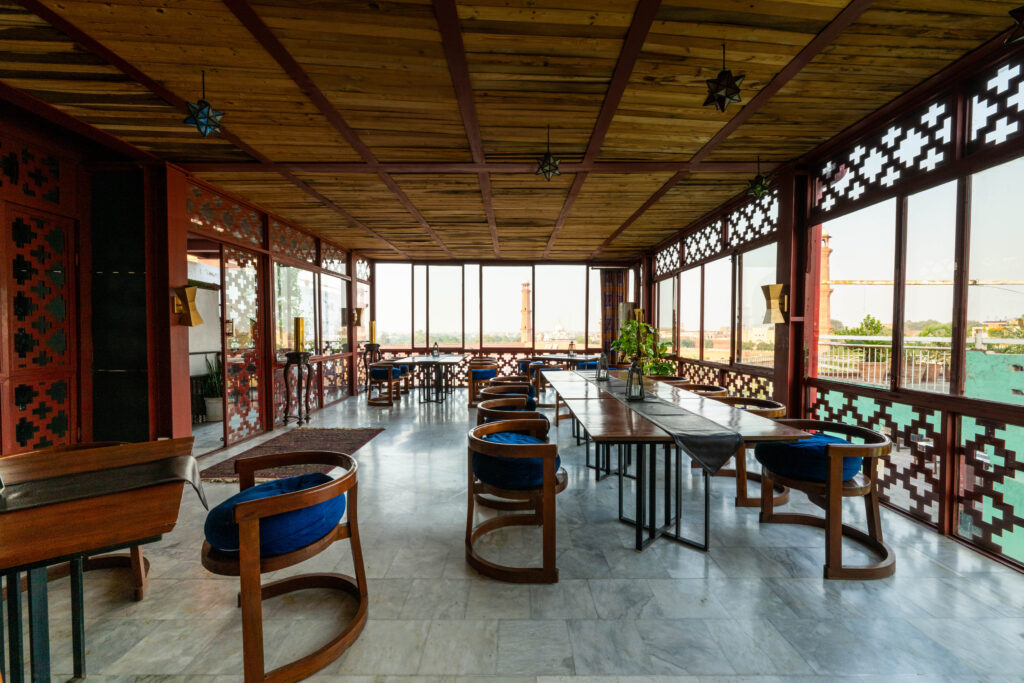 The top terrace sits above the house, overlooking the Badshahi Masjid and the old city beyond.
